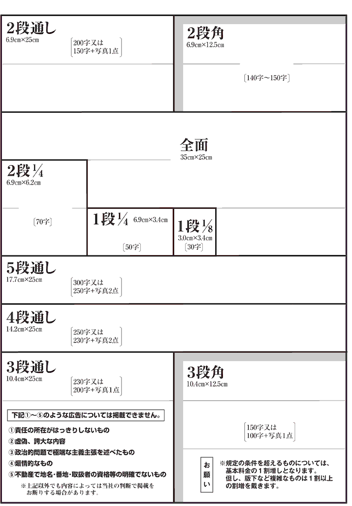 まずご相談ください。広告のデザインが決まっていなくても、こちらでデザインもさせていただきます。広告を出したい日にあわせて発行日を設定することもできますのでまずは、ご相談ください。 |